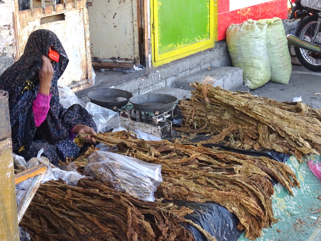 We’d secured a ride with a Beluch man in his truck, laden with polystyrene blocks, as far as Minab, which hosts the region’s most colourful market every Thursday. The town sits just back from the coast and was part of an ancient spice route linking Arabia, Persia, Africa and India. In vivid contrast to the traditional black chadors that dominate most markets in Iran, Bandari ladies dress in their brightly patterned chadors and matching headscarves. Many of them wear the traditional embroidered masks, which to the initiated can reveal their history, village and social status. Huddles of women from around the province chatter away in Farsi, Urdu or Arabic, selling fabrics, tobacco and the tasty fermented fish ‘jam’, a flavour that dominates the unique cuisine of the region.