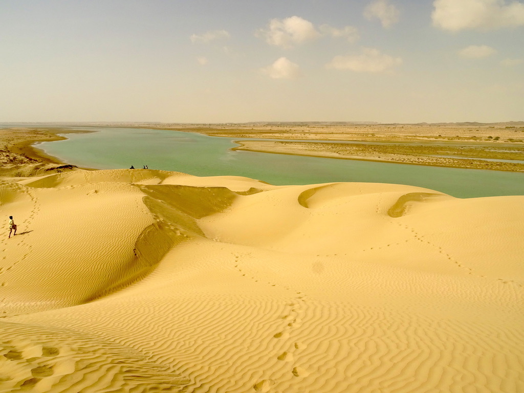 Boarding a couple of speed boats with our new friends we jetted around a stunning estuary system past the remains of an ancient settlement, to a spot where we were surrounded on all sides by towering dunes. After clambering comically knee deep in sand to the top for a photo shoot, we were gifted a 360 degrees panorama of the dunes plunging dramatically into the turquoise waters of the Persian Gulf.