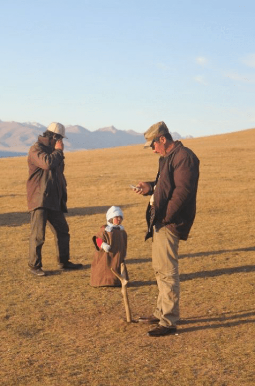 A slow criss-cross tack down the slopes and we are back at Nurgul’s camp in time for afternoon tea and nibbles. We are adjusting nicely to the pace of life on the plains. At dusk I wander a few hundred metres up the slope to a stake in the ground that marks the local communications centre; it’s the only spot within a twenty kilometres radius where there is a mobile phone signal! Every evening horses and pick-ups converge on this small space to connect with the outside world. Technology meets tradition; I’m warmed by the joyous expressions of families connecting with relatives who have been tempted by a more settled way life.