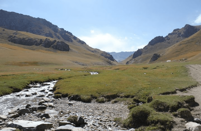 Next morning we head out into the narrow valley that once linked China with the Kharakhanid capital of Burana, just east of modern day Bishkek. Riding horses along the valley floor takes us through a breath-taking wilderness among yaks, cows, horses, and shaggy herding dogs. Amongst the peace and stillness of our surroundings, it’s easy to imagine the majesty of an ancient camel caravan snaking its way towards the caravanserai. These traders ‘motels’ were dotted at 30 – 50km intervals along the route providing protection, shelter, storage – and doubtless some bawdy behaviour! Seldom did goods travel the whole route from China to the west; most moved back and forth around the network through a series of middlemen who traded at these caravanserais. Before dinner we take a walk up the hills above our yurts to enjoy the views of the sun disappearing beyond the valley one last time.