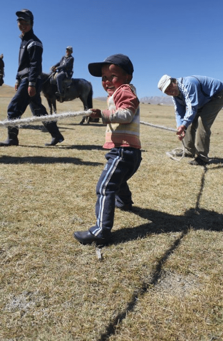Its time for our first tour treat! Traditional games are still the ultimate test of a Kyrgyz horseman’s riding skills, so we set our cameras to sports mode and gather outside our yurts to watch the action I’ve arranged. I decided to spare a goat whose carcass would have formed the ‘ball’ for Ulak Tartysh, so we instead enjoy Tiyin Enmei, watching riders defy gravity by hanging by from saddles at speed to pick up money from the dewy ground. The stomping of hooves and jettisoned earth marks a series of Chabysh, speed races, which precede the match making game of Kyz Kuumai. Its classic boy meets girl stuff – only on horseback! Suitor chases girl; if caught she has to fend him off with a whip –or a kiss seals the deal. The final game is Oodarysh, horseback wrestling. We wince as the horses draw side by side and the two young men grapple themselves into a knot of limbs until one submits.