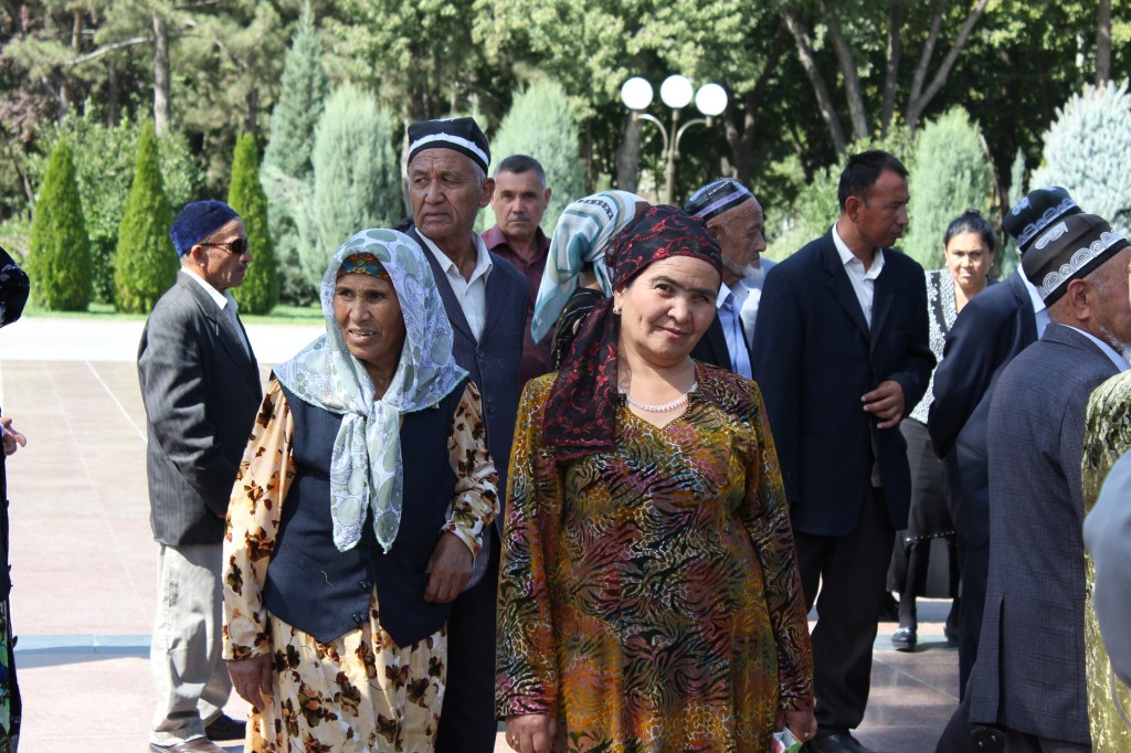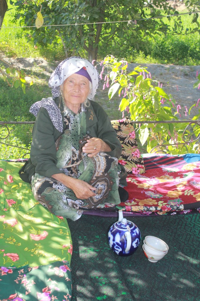 The road offers a great opportunity to witness rural life close up. Having stopped at several different villages on this road, I know that a traditional Uzbek welcome is never far away! An hour or so from Samarkand we clambered out of our bus and down the mud road that leads to Arba village. We arrived just in time to watch the village ladies bring their milk out to the roadside for collection. We provided instant amusement for the colourfully dressed women folk, whose collective laughter revealed a treasury of gold-toothed smiles. We are beckoned in for tea, but reluctantly decline to explore deeper into the village. The ladies try again, this time asking that we visit a near 100-year-old relative. So inside a large courtyard sitting on a Chororya, tea bed, we met the lovely Rakima who offered tea and blessings as one by one we queued to shake her hand.