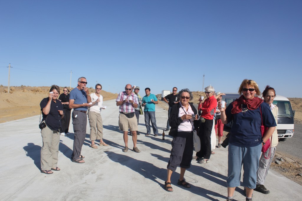 The final road journey of our Silk Road Odyssey, wouldn’t offer us the spectacular scenery of our previous travels. However the ten hour bump n’ weave across the desert promised us a glimpse of the mighty Amu Darya river, the Oxus of Greek legend. The reality however was hardly the stuff of romance; standing on a freshly laid strip of Korean tarmac squinting through desert dust at a murky grey expanse of water in the distance. In true Wild Frontiers spirit though, we managed to turn the occasion to our advantage. The whisky cake, which had travelled nearly 2700 kilometres along the Silk Road and crossed five borders, was auspiciously sliced and ceremonially consumed – along with the Uzbek muscatel.