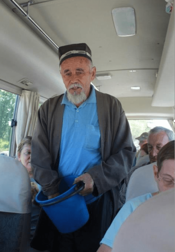 By now we had attracted the attention of local schoolboys, and I lost sight of my group as I stopped to talk. My latest friends soon pointed me to another house, where the head farmer of the village was generously spreading local honey on home baked bread and passing round tea. Before we can depart the chap whose tea we initially declined is back with us wandering around the bus, handing out his apples from a bucket. As in Tajikistan, we feel warmed and humbled by the genuine hospitality of the locals towards strangers.
